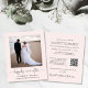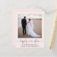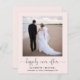 Suelo rosa claro y asequible, pequeña invitación boda e invitación a recepción. La parte frontal muestra su foto, "felizmente siempre después" en un elegante guión de caligrafía con toques y sus nombres, fecha de boda y ubicación. En la parte posterior, personalizar la invitación de su boda y la recepción o la invitación de la fiesta, ingresa la dirección de su sitio web boda para crear un código QR para que los invitados puedan escanear para ver sus fotos de bodas, todos los detalles y para RSVP en línea y firmar sus nombres casados en un guión tipo firma.