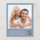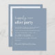 Invitación a la celebración de una boda con un presupuesto fácil y polvoriento de color azul moda con "Feliz eterno después de Fiesta" en una mezcla de escritura blanca contemporánea y letras blancas minimalistas y audaces, tu invitación y tus nombres en un guión característico. En la parte posterior, cargue su foto e introduzca la dirección de su sitio web boda para crear un código QR para que sus invitados puedan escanear en línea a RSVP y obtener detalles adicionales del boda. Este papel semibrillante de presupuesto es similar en peso al papel fotográfico. También está disponible una versión más grande del stock de tarjetas 5x7 (envíenos un mensaje para el enlace).