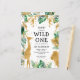 Celebra el primer cumpleaños de tu pequeño salvaje con esta invitación temática de safari en la jungla, que incluye animales de Relieve metalizado de imitación dorados (jirafa, león y monos), follaje de oro y selva verde y una rociada de confeti de oro. Agregue el nombre y los detalles del fiesta de su hijo en texto negro sobre un fondo blanco. Un patrón de follaje de jungla en color verde y dorado sobre fondo blanco decora la parte trasera de la tarjeta.