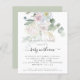 Eucalipto Floral Boho Bebé En Invite A La Bloom. Una alternativa económica para SMALLER de 4,5" x 5,6". Disponible en un ALMACENAMIENTO DE TARJETAS SEMI GLOSS 110 lb o en un SATIN FINISH DE PAPEL DELGADO DE 80 lb. Los sobres son un extra opcional. Flores de estilo bohemio moderno y follaje en verde sabio y rosa desde arriba con matiz graduándose para caer parcialmente detrás del texto. Baby In Bloom está en una escritura a mano. Personaliza fácilmente el texto a tus propios detalles.