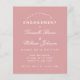 Una sencilla invitación a la fiesta de compromiso con un color moderno: rosa polvoriento. Sólo tiene texto blanco sobre fondo azul polvoriento. Los nombres se escriben en un guión caligráfico elegante, el resto en mayúsculas. la primera línea es el texto en arco.