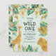 Celebra el primer cumpleaños de tu pequeño salvaje con esta invitación temática de safari en la jungla, que incluye animales de Relieve metalizado de imitación dorados (jirafa, león y monos), follaje de oro y selva verde y una rociada de confeti de oro. Agregue el nombre de su hijo y los detalles del fiesta en texto negro sobre un fondo verde pálido. Un patrón de follaje de jungla en verde y oro decora la parte trasera de la tarjeta.