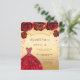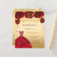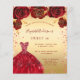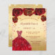 Una invitación moderna, elegante y glamurosa para una fiesta de 16 y 16 años. Un fondo de oro falso con polvo falso purpurina de oro, un vestido y rosas rojas, flores. El nombre está escrito con una escritura de estilo con letras a mano moderna. Personalice y agregue los detalles de su fiesta.