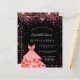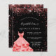 Una invitación moderna, elegante y glamurosa para una fiesta de 15 años en Quinceañera. Un fondo negro de moda con polvo rojo falso purpurina y un vestido. El nombre está escrito con una escritura de estilo con letras a mano moderna. Personalice y agregue los detalles de su fiesta.