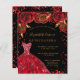 Una invitación moderna, elegante y glamurosa para una fiesta de 15 años en Quinceañera. Un fondo negro con chispas, un vestido rojo y rosas rojas, flores. El nombre está escrito con una escritura de estilo con letras a mano moderna. Personalice y agregue los detalles de su fiesta.