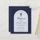 Una invitación moderna al bautismo. Sobre un fondo azul marino, tiene un arco blanco con texto azul marino dentro. La palabra bautismo y el nombre están escritos en un guión caligráfico elegante; la primera línea es texto arcaico.