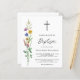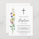 Esta invitación al bautismo económico está decorada con flores silvestres y una cruz. Personalizable fácil. Acuarela original © Michele Davies.