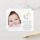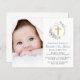 Una elegante invitación al bautismo amigable con el presupuesto que incluye la foto de tu hijo o hija, un ilustracion acuarela de una cruz de oro en un marco de corona geométrica de oro adornado con vegetación de eucaliptos verde sabio y su nombre en un guión de caligrafía verde sabio.
