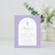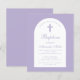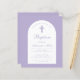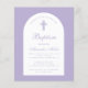 Una invitación moderna al bautismo. Sobre un fondo de lavanda (púrpura claro), tiene un arco blanco con texto de lavanda dentro. La palabra bautismo y el nombre están escritos en un guión caligráfico elegante; la primera línea es texto arcaico.