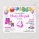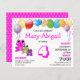 Invitación a la fiesta de cumpleaños de una chica rosada linda, con presupuesto que muestra un trío de vibrantes ranas de ojos anchos y una variedad de globos coloridos. En la parte delantera, puede personalizar el nombre y la edad del niño, además de la fecha, los detalles del prVp y el lugar de celebración. El fondo incluye un patrón de baldosas bonitos vinculado a la edad principal, que se repite al revés. Todo lo que necesitas hacer es cambiar el número una vez, y automáticamente cambiará el patrón. (Se trata de invitaciones presupuestarias de buena calidad, por lo que no olvide añadir sobres y/o transferir diseño al material de la tarjeta si lo prefiere.) Este diseño es adecuado para cualquier edad hasta los 9 años.