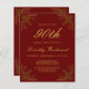 Esta elegante invitación de fiesta de cumpleaños inspirada en la cosecha de vintage presenta el texto en escritura de color oro y fuentes serif en un fondo rojo burdeos, enmarcado por motivos decorativos de oro ornamentados en las cuatro esquinas. Los motivos de la esquina se repiten al revés.