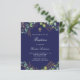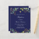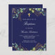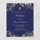 Un fondo azul marino decorado con eucalipto verde y hojas doradas. Personalización y nombre del niño y detalles de la ceremonia. Fondo azul marino