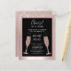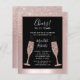 Con un fondo de Relieve metalizado metálico rosa rubor, nuestra invitación para la fiesta de cumpleaños número 21 presenta un diseño negro femenino de color oscuro purpurina con burbujas de gafas de champán listas para brindar por el honorario de cumpleaños número 21. En un marco negro con un borde dorado subió, encontrará un texto de ejemplo que puede revisar fácilmente en la plantilla de personalización.