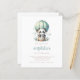 Esta tierna invitación a la fiesta de cumpleaños incluye un panda de acuarela dulce en un globo de aire caliente verde menta rodeado de nubes y flores rosas, encima de las palabras "¡por favor, únete a nosotros para la fiesta de cumpleaños de [name]!" en letra cursiva marrón. Personalízalo con el nombre de su hijo en letras con dibujos en verde menta, con los detalles en letra sans serif marrón en un fondo blanco. Ideal para una panda de chicas, aventura, viaje o fiesta de primer cumpleaños con temas de globo aerostático.