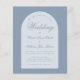 Una invitación moderna a la boda. Sobre un fondo azul polvoriento, tiene un arco blanco con un texto azul polvoriento. La palabra Boda y los nombres se escriben en un guión caligráfico elegante, la primera línea es el texto arcaico.
