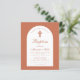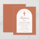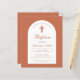 Una invitación al bautismo para el bautizo de un niño. En un color moderno, de color marrón terracota, tiene un arco blanco con texto de terracota en el interior. La palabra bautismo y el nombre están escritos en un guión caligráfico elegante; la primera línea es texto arcaico.
