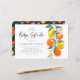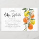 Invite a su familia y amigos a su evento con esta invitación botánica para rociar a su bebé. Cuenta con una zona acuática de naranjas, limones, flores de naranja y vegetación con un patrón cítrico a juego. Personalice agregando un nombre, fecha, hora, lugar, dirección y otros detalles del evento. Esta invitación a los cítricos es perfecta para las duchas de verano. Los elementos coincidentes están disponibles.