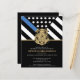 Honren la dedicación y el duro trabajo de un nuevo agente de la policía con esta invitación a graduarse de la policía personalizable. Con la insignia de la policía y la bandera de la fuerza policial con audaces franjas en blanco y negro y una orgullosa delgada línea azul, este diseño simboliza fuerza, servicio y sacrificio. La invitación se personaliza con el nombre del graduado con letras de oro, lo que lo convierte en un recuerdo memorable para amigos, familiares y colegas oficiales. Perfecto para celebrar la graduación, promoción o hito de una academia de policía en la carrera de un futuro oficial. Invite a sus invitados con estilo y muestre su apoyo al miembro más nuevo de la comunidad de la delgada línea azul.