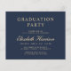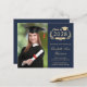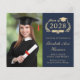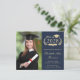 Moderna invitación de graduación universitaria a base de presupuesto azul oscuro e invitación de fiesta con "Clase de" y el año dentro de una corona de laurel, un gorro de grado y un diploma, una foto del graduado y su nombre en un elegante guión dorado claro. Añada su escuela, su escuela principal, honores o planes futuros. Al revés, añada los detalles del fiesta.