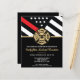 Este diseño cuenta con una bandera de bomberos con rayas blancas y negras y una delgada franja roja. Una insignia de bombero se sienta sobre todo los detalles del fiesta para el bombero que se gradúa. Este diseño también funciona bien para un bombero, teniente o fiesta de retiro en jefe.
