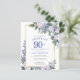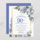 Honre a una mujer especial con esta elegante y femenina invitación del Partido Sorpresa del 90 cumpleaños. Sorpresa y 90 están escritas en grandes textos azules. Sigue la celebración del cumpleaños. El nombre de la persona honrada también está escrito en mayúsculas azules. Los detalles de la celebración de cumpleaños están rodeados por un marco dorado de moda. Las flores azules y las rosas blancas se esconden en hojas verdes profundas.