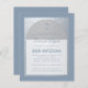 Una invitación mitzvah de la barra de presupuesto. Sobre un polvoriento fondo rectangular azul, tiene un falso arco de Relieve metalizado plateado que tiene dentro de un polvoriento texto azul sobre fondo blanco. El nombre está escrito en un guión caligráfico elegante; Hay una (falsa) estrella plateada de David encima del texto.