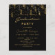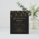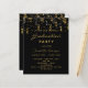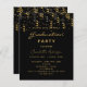 Una invitación moderna y de diseño para una fiesta de graduación. Tanto para él como para ella. Un fondo negro clásico y un fiesta dorado y negro como decoración. Personalice y agregue un nombre y detalles del fiesta. El texto Graduación y el nombre se escriben con un estilo de escritura moderno con letra a mano. Cartas doradas.