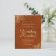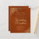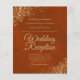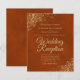 Estas invitaciones a la recepción de bodas asequibles y económicas son la elección perfecta para disfrutar de clase, estilo y belleza a buen precio. Están pensadas para los invitados a la recepción, pero no para la ceremonia, y cuentan con un naranja de óxido de mármol o un fondo de color madera quemado con adornos adornados de encaje de imitación de Relieve metalizado dorado en las esquinas. La tipografía incluye lujosas letras de guiones dorados para un estilo que es a la vez simple y elegante. Una forma maravillosa de invitar a tus amigos y familiares a compartir tu alegría en tu día especial sin romper el banco.