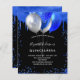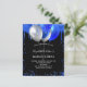 Una quinceañera femenina y femenina, 15ª invitación a la fiesta de cumpleaños. Delante: Un fondo negro de moda. Decorada con tonterías purpurinas de color azul real, pinturas de goteo y globos. Personalice y agregue un nombre y detalles del fiesta. El nombre se escribe con un guión de estilo con letras a mano.