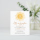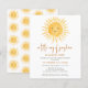 ¿Está planeando una ducha de bebé con temática solar? Esta invitación a una ducha de bebé barata incluye el texto "¡Un pequeño rayo de sol está casi aquí!" con una hermosa acuarela sonriente sol amarillo. Hay un lindo patrón de sol en la parte trasera. Perfecto para una ducha para bebés sin diferencias de género. Personalizable fácil. Acuarela original © Michele Davies.