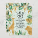 Esta invitación a la ducha de bebé con temática de safari "salvaje" tiene animales de Relieve metalizado de imitación dorados (jirafa, león y monos), follaje dorado y verde de la jungla, y una rociada de confeti dorado en un fondo verde pálido. Añade el nombre de la futura madre y los detalles de la ducha en texto negro. Un patrón de follaje de jungla en verde y oro decora la parte trasera de la tarjeta.