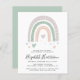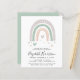 Invitación a una ducha de bebé boho moderna y divertida con un presupuesto reducido, con una acuarela abstracta de un arcoiris verde sabio, naranja y lavanda con corazones, el nombre de la madre en un guión elegante y los detalles de la ducha en una tipografía simple.