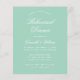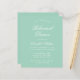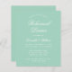 Una simple invitación a la cena. Sólo tiene texto blanco sobre fondo verde menta. Las palabras "Cena escénica" y el nombre están escritas en un elegante guión caligráfico.