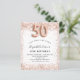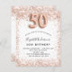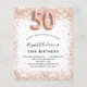 Por un elegante cumpleaños número 50. Un fondo blanco. Decorada con oro rosa, purpurina falso rosa y chispas. Personalice y agregue un nombre y detalles del fiesta. El nombre está escrito con un guión de estilo con letras a mano, número 50 con fuentes de estilo globo.