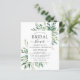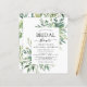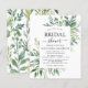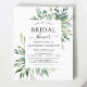 Invitaciones de Despedida de Soltera de Bodas de Primavera con Acuarela Botánica Floral Económica sobre fondo verde y blanco - incluye tipografía de letra cursiva hermosa y elegante con hojas botánicas modernas y vegetación para la celebración de la Novia Especial.