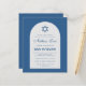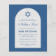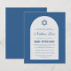 Una invitación de bar mitzvah económica. Sobre un fondo azul clásico, tiene un arco blanco con texto azul en el interior. El nombre está escrito en una elegante letra caligráfica. Sobre el texto hay una estrella de David azul.