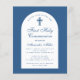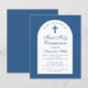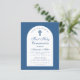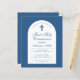 Una invitación moderna para la primera comunión. Sobre un fondo azul clásico, tiene un arco blanco con texto azul en el interior. La ocasión y el nombre están escritos en una elegante letra caligráfica; la primera línea es texto arqueado.