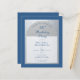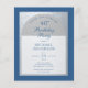 Sobre un fondo rectangular azul clásico, tiene un arco de falso foil plateado que tiene dentro texto azul sobre fondo blanco. Las palabras Fiesta de Cumpleaños están escritas en una elegante letra caligráfica; la primera línea es texto arqueado.