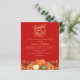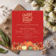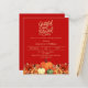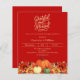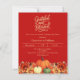 Un color de fondo rojo profundo. Decorado con calabazas y flores naranjas y amarillas. Personalice y agregue los detalles del fiesta. Guión de texto: Agradecido y bendecido. 1 hoja = 1 borde impreso de invitación al borde.