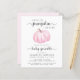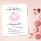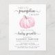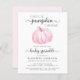 Una linda, alegre y económica invitación de baby sprinkle para niña que presenta "Una pequeña calabaza dulce está en camino" escrita en una mezcla de tipografía moderna gris suave y letra script elegante, y una calabaza de acuarela rosa pastel. Puedes personalizar el nombre de la madre y los detalles de la ducha en tipografía gris simple.