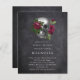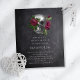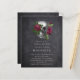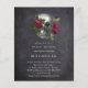 Una invitación de boda con una calavera gótica y flores.