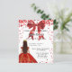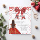 Una invitación moderna, elegante y glamurosa para una fiesta de 15 años en Quinceañera. Un fondo blanco con confeti, un vestido rojo y un arco rojo. El nombre está escrito con una escritura de estilo con letras a mano moderna. Personalice y agregue los detalles de su fiesta. 1 hoja = 1 borde impreso de invitación al borde.