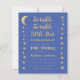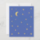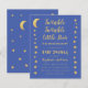 Una invitación de baby shower de presupuesto con estrellas doradas y luna en los bordes izquierdo y derecho. Tiene fondo azul. El texto es amarillo dorado. El título "Twinkle Twinkle Little Star" y el nombre están escritos en una escritura a mano dorada, con pequeñas estrellas en la i de las palabras "Twinkle". En la parte posterior, solo hay estrellas y la luna.