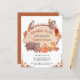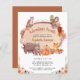 Invitación a una ducha de bebé de temática otoñal, rústica y económica, con una cortina acuarela compuesta por un tronco de árbol, acuarelas adorables de animales de bosque (búho, ardilla, oso y zorro), y follaje y calabazas de flores caídas. "Adventure Awaits" y el nombre de la futura madre están escritos en un guión de terracota.