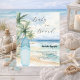 Una elegante invitación para un Baby Shower, celebrando a un bebé. Una playa de arena de color agua, olas del océano y palmeras como telón de fondo, y una tabla azul en la playa. 1 hoja = 1 borde impreso de invitación al borde.