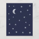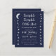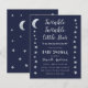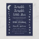 Una invitación de baby shower económica con estrellas y luna en los bordes izquierdo y derecho. Tiene fondo azul marino. El texto es gris claro y blanco. El título "Twinkle Twinkle Little Star" y el nombre están escritos en una escritura dorada a mano, con pequeñas estrellas en la i de las palabras "Twinkle".