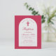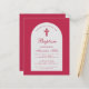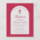 Una invitación de bautizo para el bautizo de una niña. En un color moderno entre magenta y rojo, tiene un arco blanco con texto rojo magenta dentro. La palabra Bautizo y el nombre están escritos en una elegante letra caligráfica; la primera línea es texto arqueado.