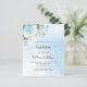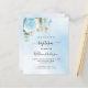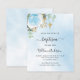Un cielo azul como fondo decorado con vegetación de eucalipto, una rosa azul claro y hojas doradas. Personalice y el nombre del niño y los detalles de la ceremonia. Letras de color negro y dorado.