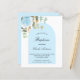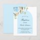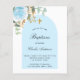 Un fondo blanco decorado con vegetación de eucalipto, una rosa azul claro y hojas doradas y un marco de arco azul. Personalice y el nombre del niño y los detalles de la ceremonia. Estilo de letra a mano elegante.