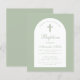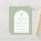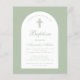 Una invitación de bautizo moderna. Sobre un fondo verde sage, tiene un arco blanco con texto sage dentro. La palabra Bautizo y el nombre están escritos en una elegante escritura caligráfica; la primera línea es texto arqueado.